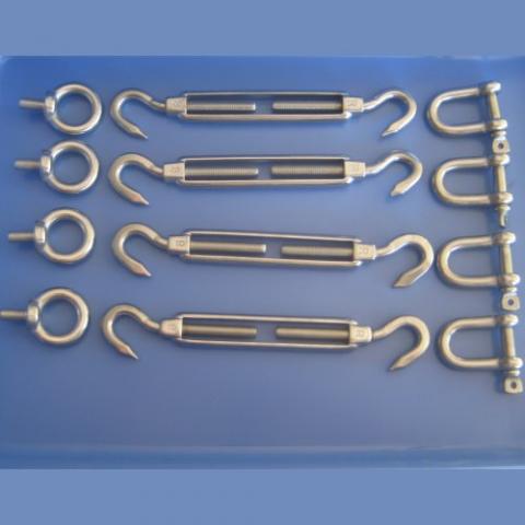 These kits includes items to attach a rectangle or square shade sail. 4 Hook/Hook Turnbuckles 4 Dee Shackles 4 Eye Bolts